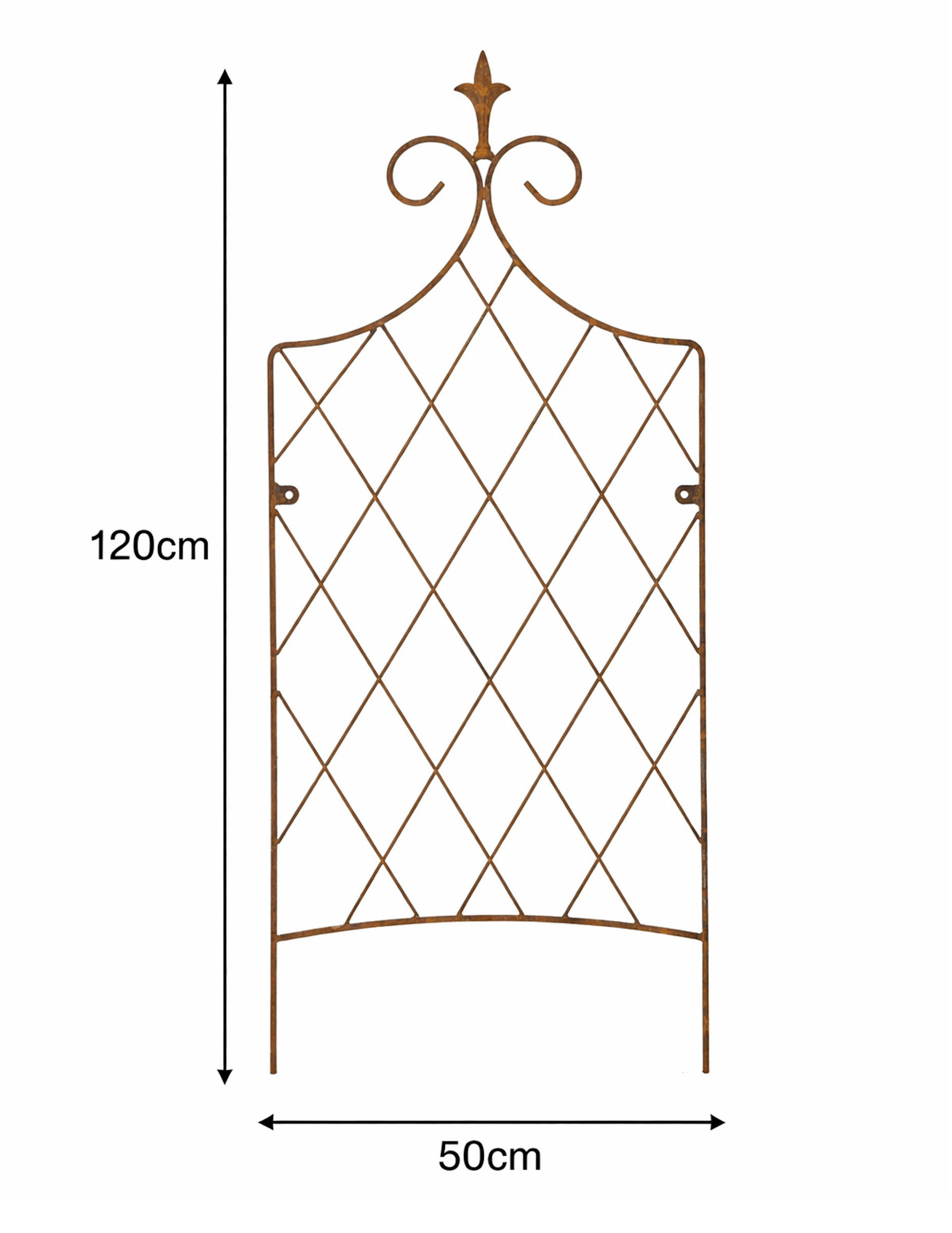 This metal rose rust trellis panel is a very decorative trellis with a feature scrolled final top, ideal for realising several garden ideas. This British handcrafted trellis is made from heavy-duty steel rod, untreated steel, allows the plant support to rust naturally over time this climbing rose trellis can be fastened to a wall or using its feet it can make a planter with trellis, in either case providing a support for climbing plants. The lattice trellis can be used as a portable garden divider, allowing many landscape garden ideas to be put into practice. Trellis can either shows off their own attractive designs, or can be planted to make living garden walls.