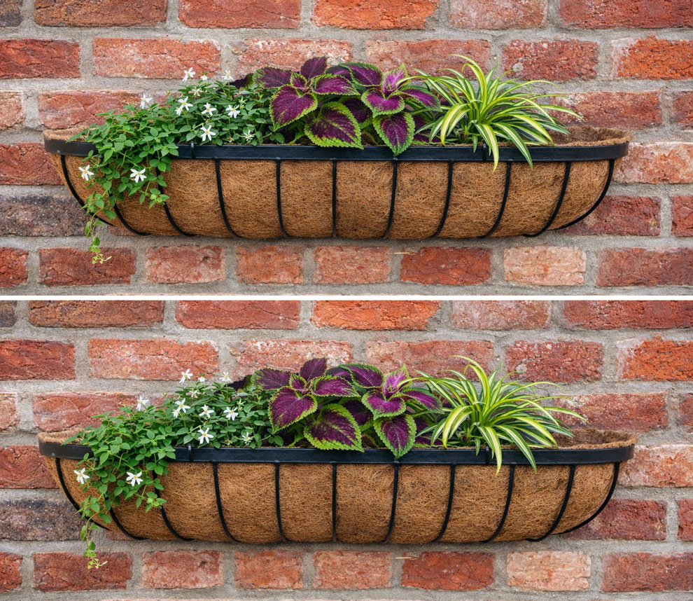 These flower basket troughs are deep giving better plant growth. These wall troughss are finished using a black power coated epoxy finish. Comes complete with a quality Coconut fibre liners.
