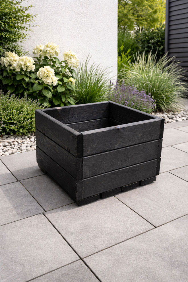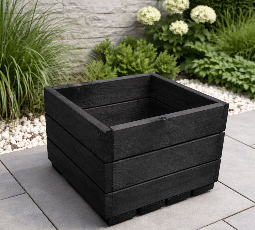 A stylish black wooden planter designed in a modern square shape, perfect for enhancing any outdoor space with a clean, contemporary look.