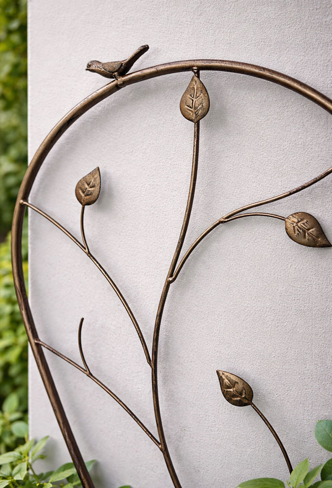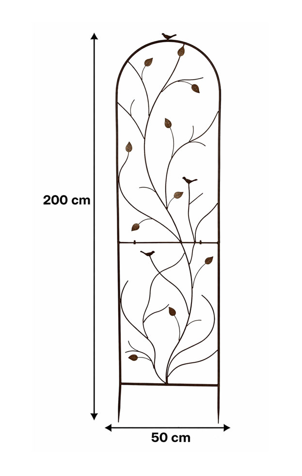 This extra tall 200cm hiigh decorative metal garden trellis is manufactured from steel with an rust effect coating for décor and protection against weathering. This plant trellises have a bird and leaf stem design. This tall trellis comes in two parts, quick and easy to fit using only two nuts and bolts which are included. This flower trellis has spiked feet, ideal for securing into the ground or large containers.