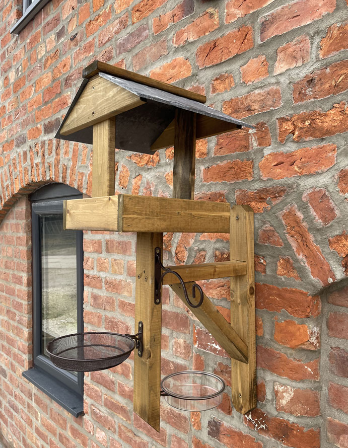 This stylish sturdy natural slate roofed bird table is suitable for mounting on garden wall and fences. This bird station complete one stop feeding station for garden birds to feed, drink and bathe. Features a micromesh feeder tray and clear plastic birdbath with metal holder and metal hook suitable for bird feeders. Suitable for feeding most bird feeds helping to attract a wide variety of garden bird. British designed and manufactured.