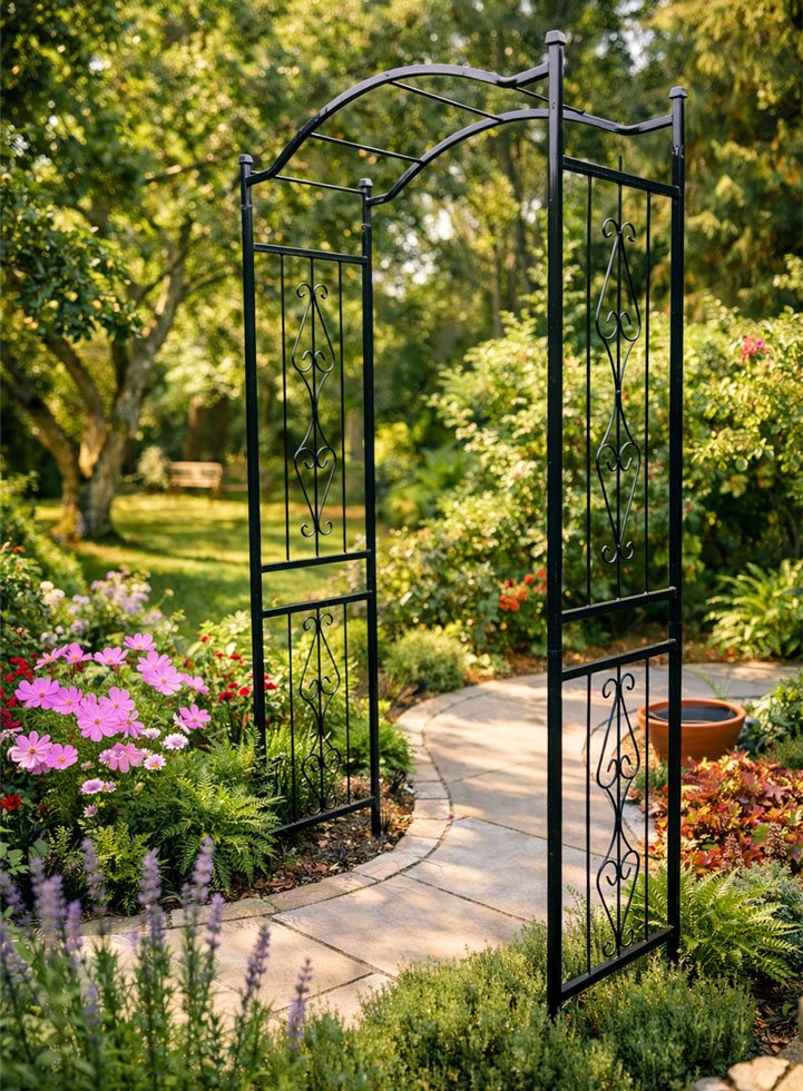 With its decorative style, this Garden Rose arch trellis will create a stunning and beautiful feature when it is covered with greenery and gorgeous blooms of colour, that can be used anywhere in the garden. This rose arch for garden has been manufactured from metal square sections with minimal joints to ensure strength and rigidity. This wisteria arch has been coated in black powder coating to protect it from the elements.