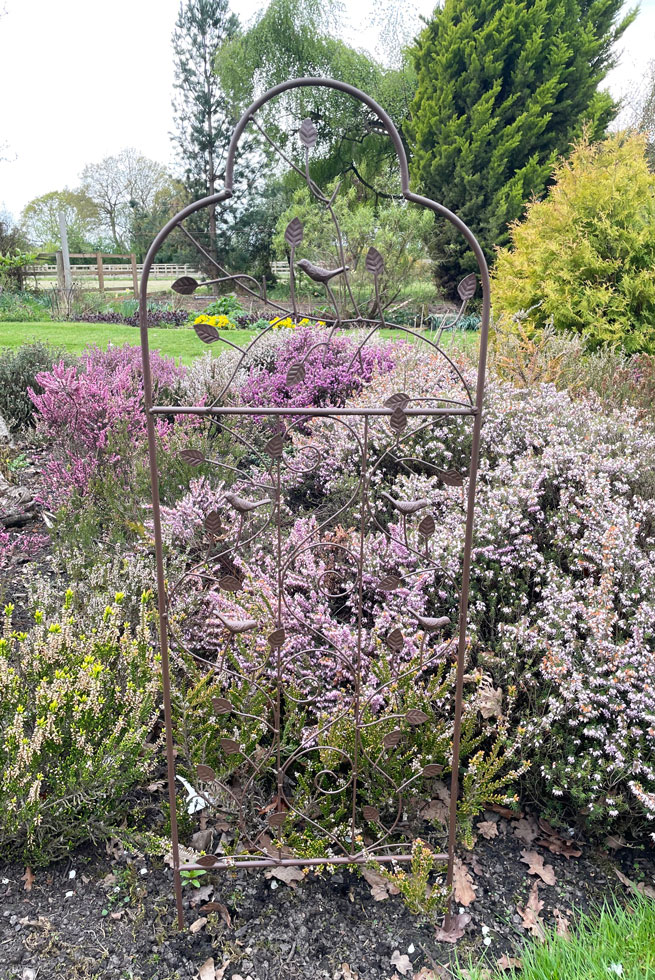 This trellis has a stunning metal work design of scrolls, perching bird and leaves design, ideal to enhance any outdoor area offering practical support for growing climbing plants and when secured to fences offering addition privacy. This iron trellis is pleasing to the eye even in winter as garden décor. Manufactured from durable metal with a rust effect powder coating finish to offer longevity.