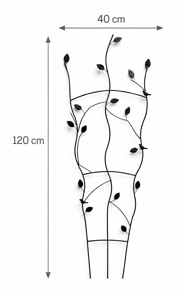 This garden trellis is both a beautiful ideal for metal wall art and functional plant frame support, offering support for climbing plants, Ideal for adding colour and elegance to otherwise plain brick walls and fences. Manufactured from steel, featuring birds and leaves. These plant trellises can be used to define different areas of the garden offering a sense of privacy. This wire trellis is finished with a black powder coating to withstand our weather conditions.