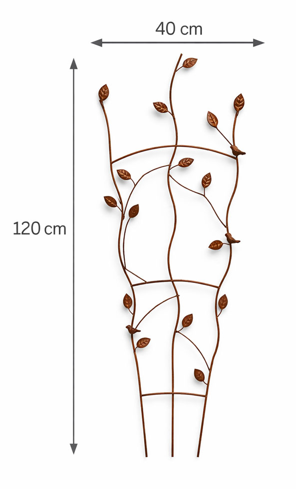 This beautifully designed metal garden frame crooked trellis is manufactured steel rod with strong welds, This wall plant support will rust naturally, allowing the trellis to blend into the background, gives a rustic natural look. This natural rust crooked trellis features a crooked metal design with bird and twig leaves. These flower supports are ideal for use with most types of climbing plants or as metal wall art.