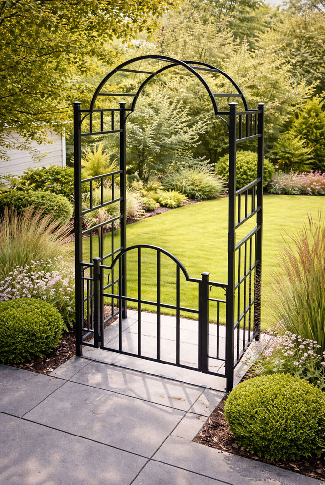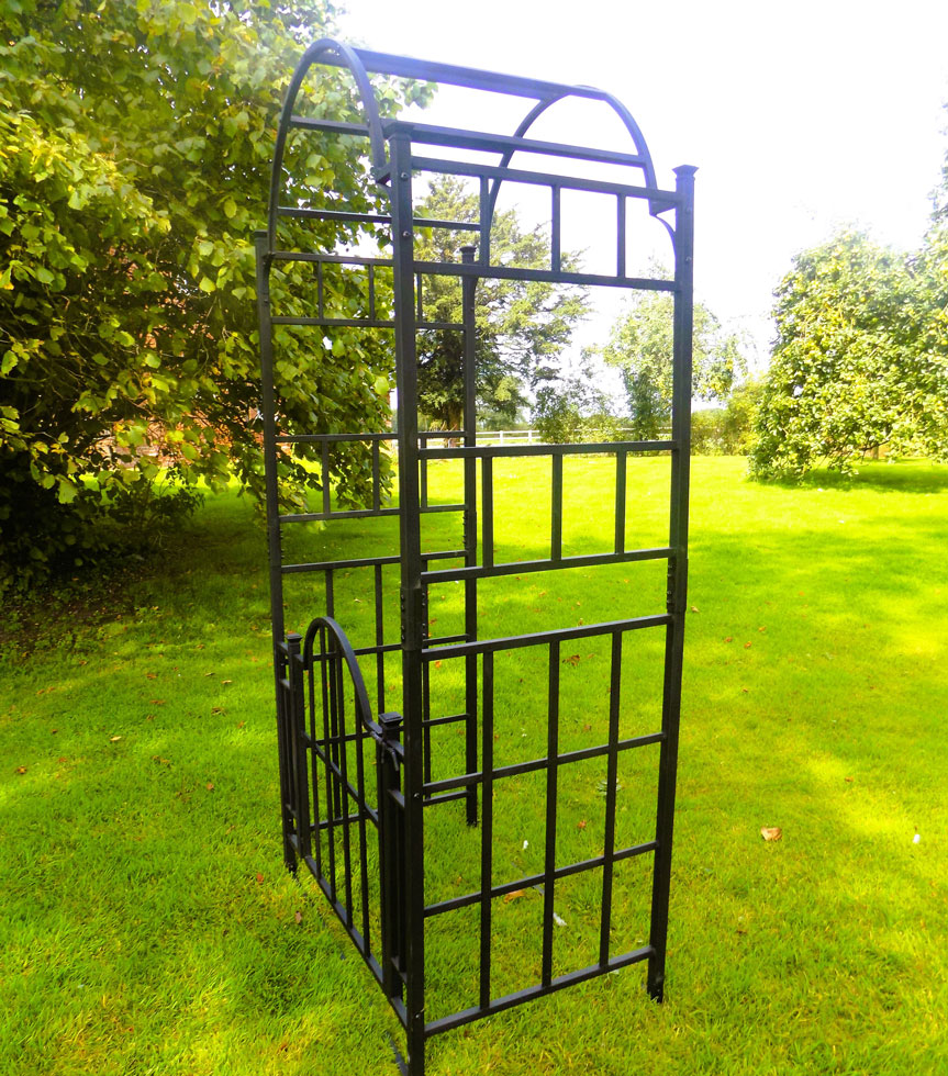 This heavy duty sturdy black garden arch with gates will create a stunning frame to a garden pathway or patio entrance. This rustic garden arch and two gates is manufactured from Heavy Duty 20mm square section steel. This metal arch trellis features lattice side panels are ideal for training of climbing plants. This steel arch comes complete with ground spikes for easy and secure fitting into soft ground. This gated garden entrance arch is finished with black powder coating to prevent discolouring and rusting.