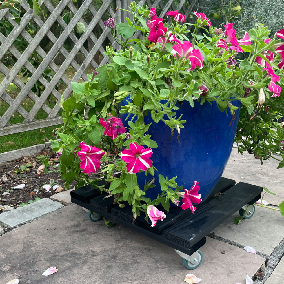 These extra large plant trolleys are ideal way for moving heavy plant pots with the minimal of effort. These wooden planter carriers with heavy-duty casters are ideal for moving heavy potted plants around the patio or other paved areas from in the sun to shade. Features four heavy duty 360 decree swivel wheels. This plant stand with wheels are made from durable, quality 2cm timber slats, finished with charcoal black stain for protection when used outdoors.