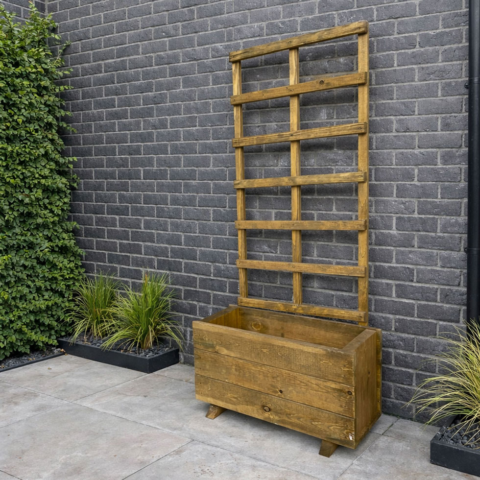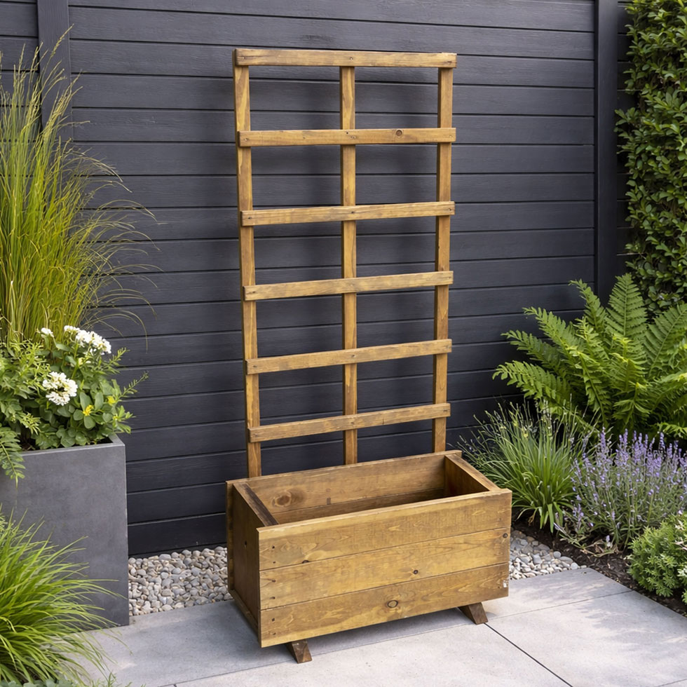 This is a very distinctive planter with trellis back is strongly hand made to our usual high standard from sustainable resources approved timber, made in Yorkshire. These planters with trellis give a free rein to you garden landscaping ideas and use this trough and climbing trellis in a large number of ways , it can be used as a barrier or area divider, or simply as a beautiful feature on a patio or drive. The depth of the planter allows for a large volume of compost so that you can keep the planting density high which in turn will help the climbing plants display mature quickly and then keep it at its stunning best.