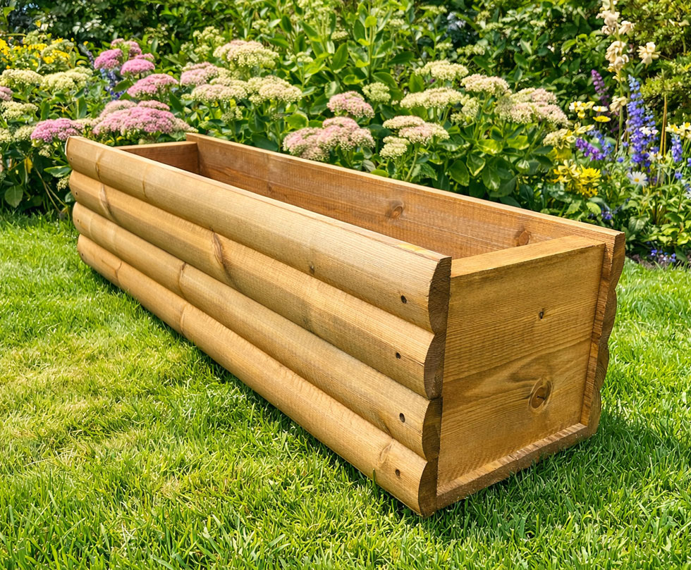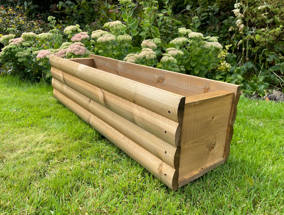 These planter boxes, design incorporates a log-shaped timbers with a lodge-style finish.
