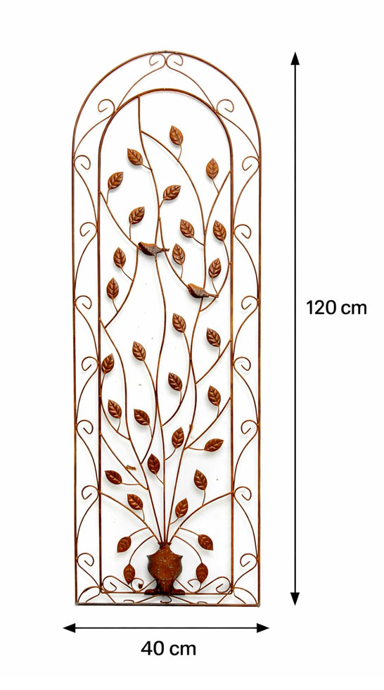 This beautifully designed metal garden frame garden trellis is manufactured steel rod, This wall plant support will rust naturally, allowing the trellis to blend into the background, gives a rustic natural look. This natural rust trellis features metal design with vase, birds and leaves. These flower supports are ideal for use with most types of climbing plants or as metal wall art.