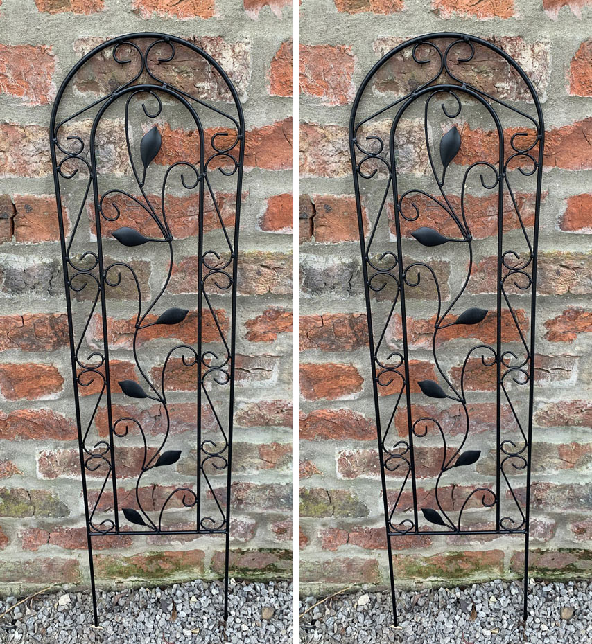 These plant trellises are crafted from quality metal panels finished with a black powder coating to withstand the elements while adding a touch of elegance to your garden. Garden metal trellis panels with sturdy legs are perfect for adorning fences, adding to walls, creating privacy screens or Suitable for use in planters and pots. This two pieces set of garden plant supports has decorative metal work, embellished with a scrolled leaf design to give it an elegant appearance.