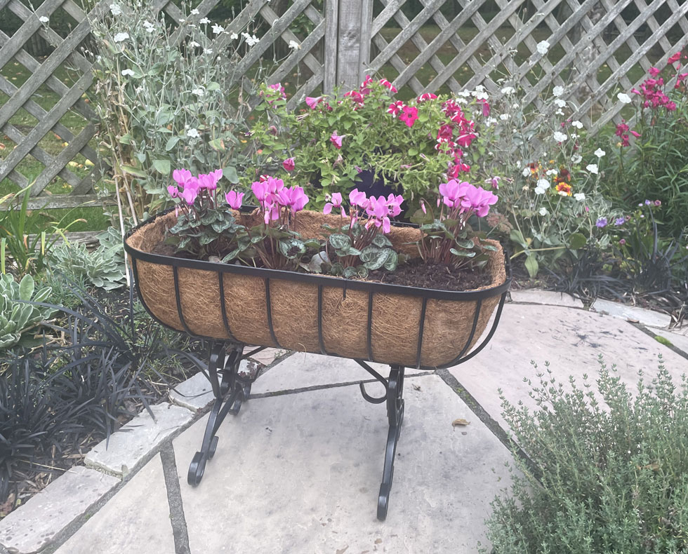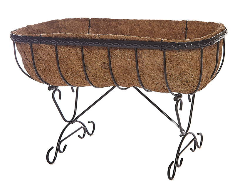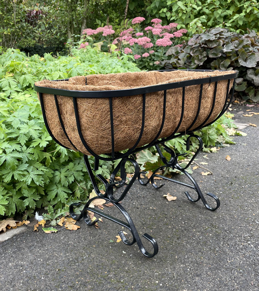 TThese cradle trough planters are from our heavy duty iron look range. These garden containers are made from solid rod and square section steel construction. These garden troughs are distinctive rim decoration. Strong welded joints. These window boxes have a tough epoxy coating for durability and the wrought iron look. These flower baskets have a quality co-co liner included in with the price.