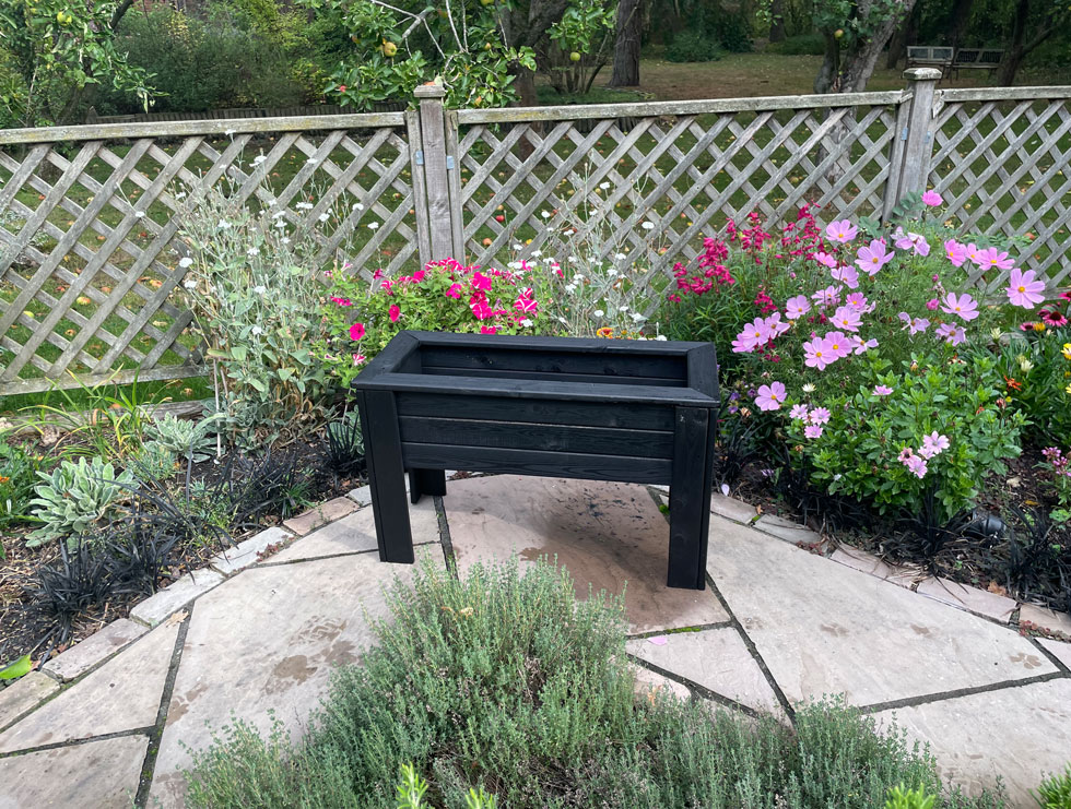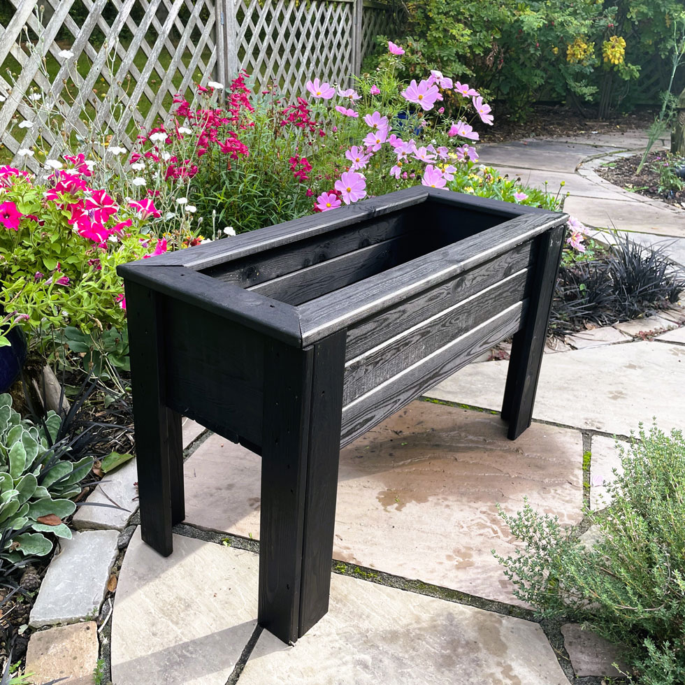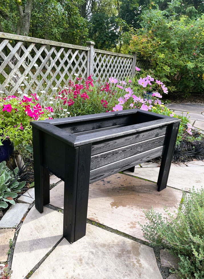 This elevated plant pot is manufactured from 18 mm thick planed timber with 35 mm end boards, finished with a plant-friendly black wood-shield stain for extra weather resistance. With this raised bed planters on legs, gardening is easier for people with mobility issues because it reduces bending or kneeling.