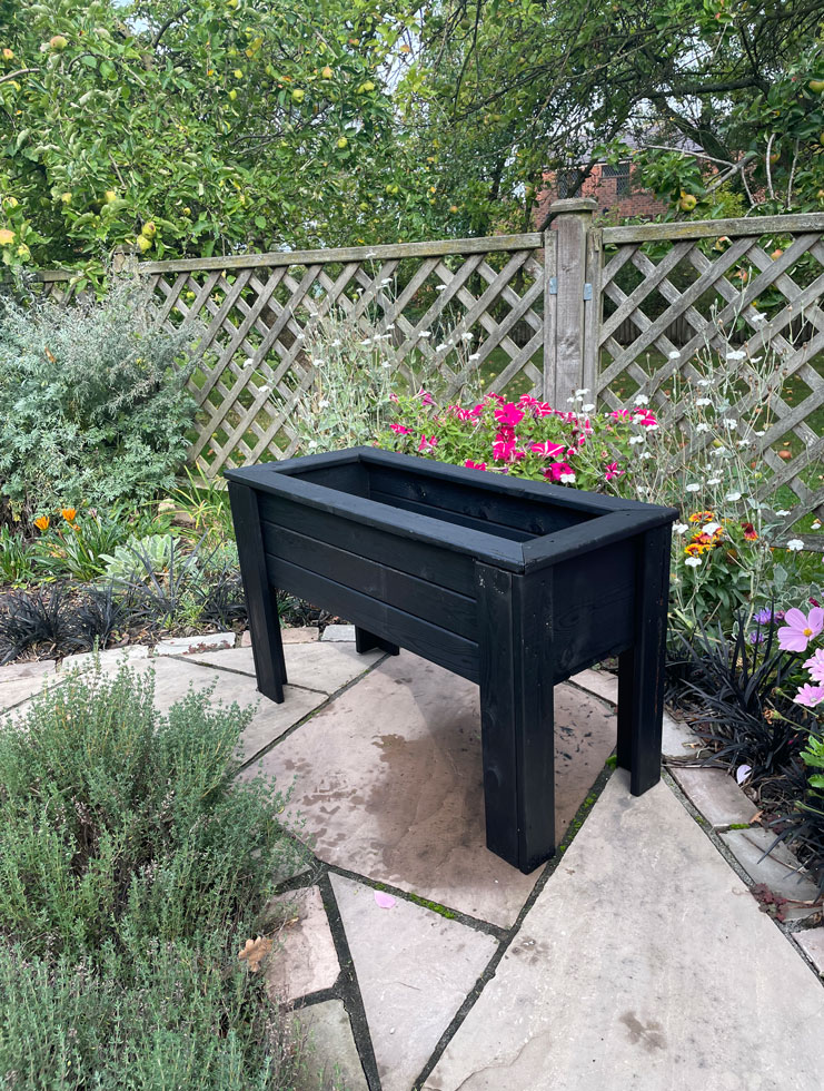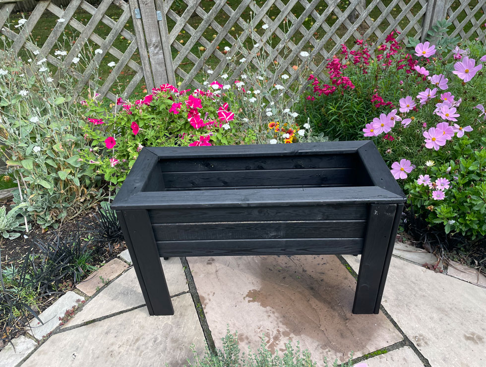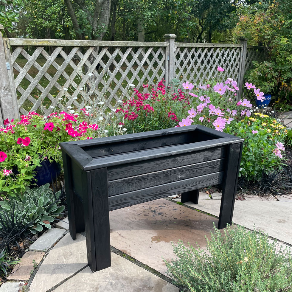 These raised veg planter are crafted from 18 mm thick planed edged timber with 35 mm end boards, coated in a plant-friendly black wood-shield stain for enhanced weather resistance.