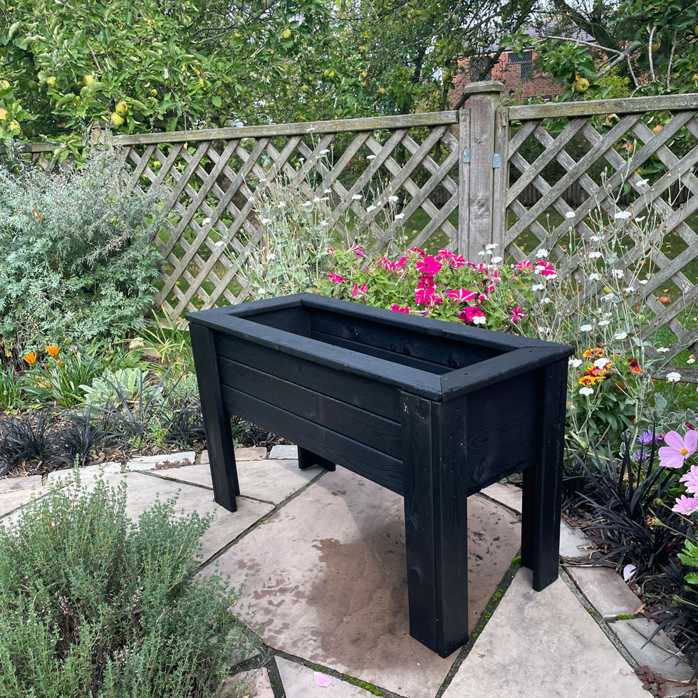 Manufactured from 18 mm thick planed edged timber with 35 mm end boards, finished with a plant-friendly black wood-shield stain that ensures extra weather resistance for these raised planters on legs.
