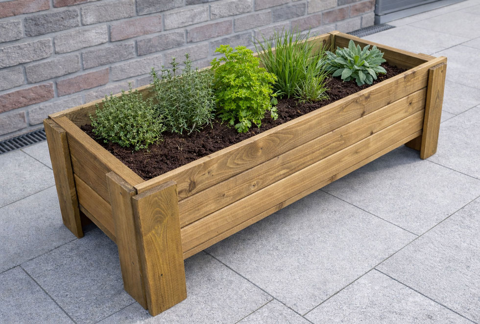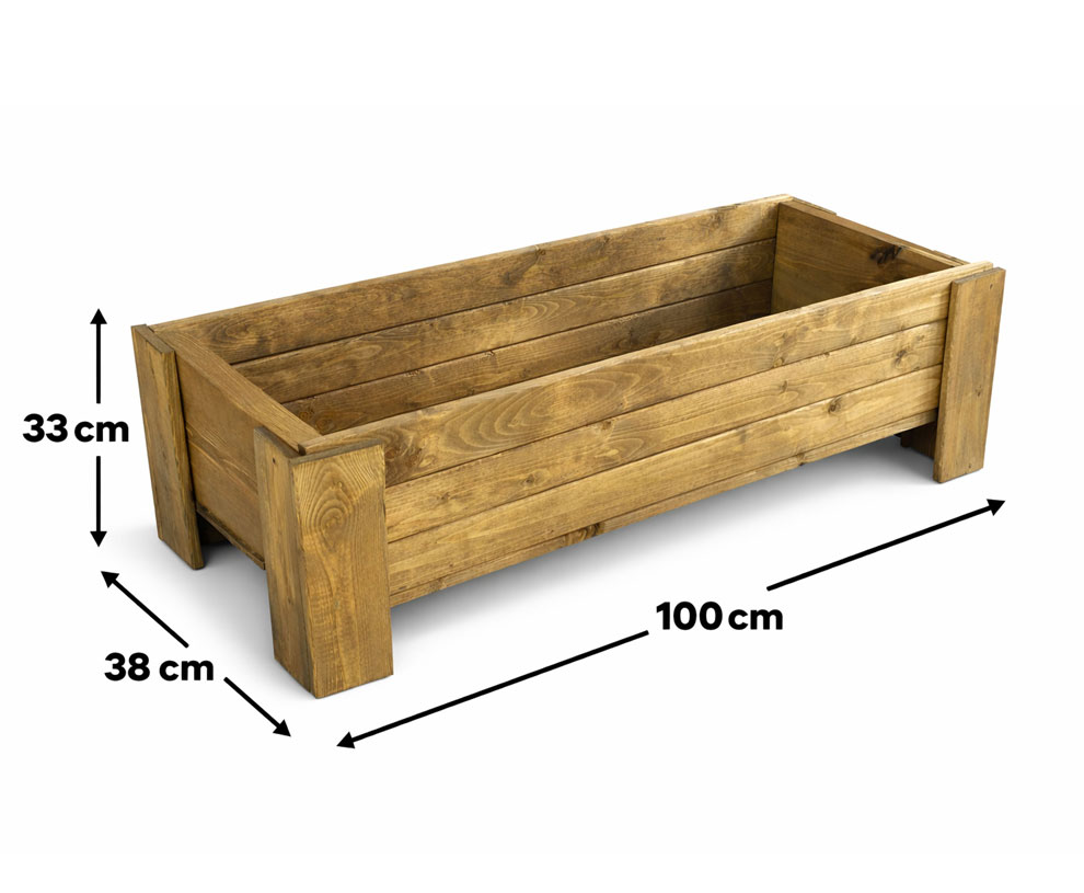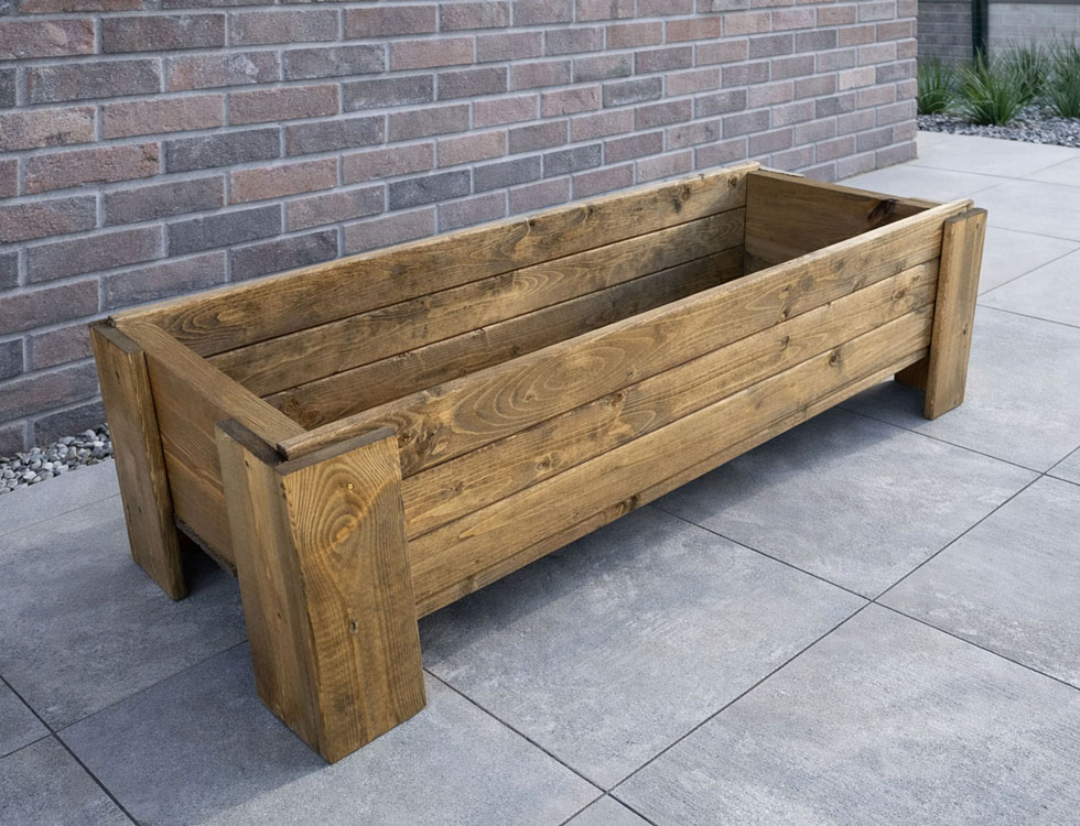 This outdoor rustic raised wooden trough planter is designed to enhance the beauty of any outside area . Tan brown Weather-shield wood stain protects timber from the elements making it a focal point in any garden or patio area. Comes Fully Assembled. Designed and handmade in Great Britain.
