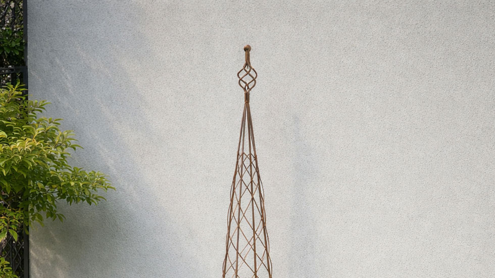 This rust twist ironwork garden plant support pyramid with spiral finial top offeris height in garden borders and can be used in garden planters and pots as a plant cllimbing frame for sweet peas. This plant garden plant supports are sesigned to rust naturally and blend in to the garden looking like its been their years adding a vintage cottage feel.