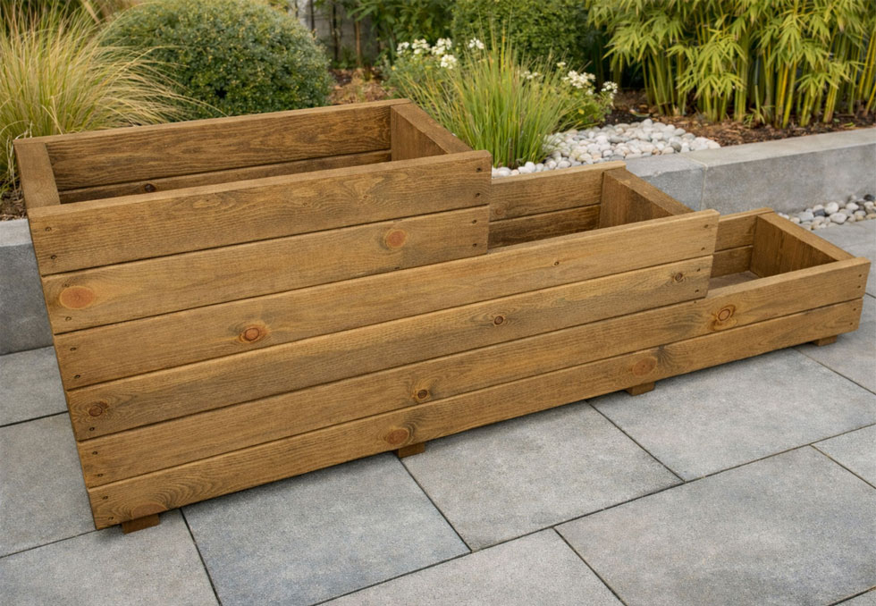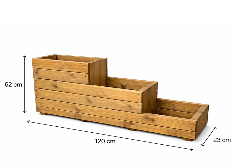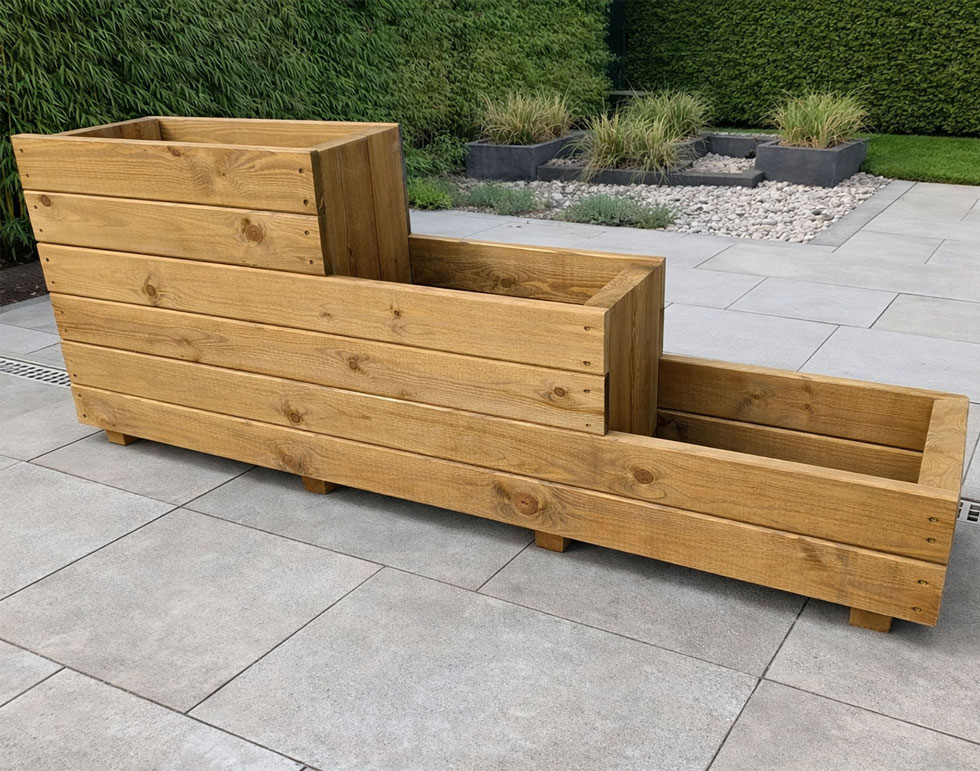 This high quality and stylish stepped wooden planter have three-tiered elevated level ideal to transform and bring colour to areas of the patio and garden. This raised bed planter can be painted or stained if desired. constructed from high quality 18mm & 35mm smooth planed round edge timbers from sustainable sources. This stepped planter is designed and constructed in Great Britain.