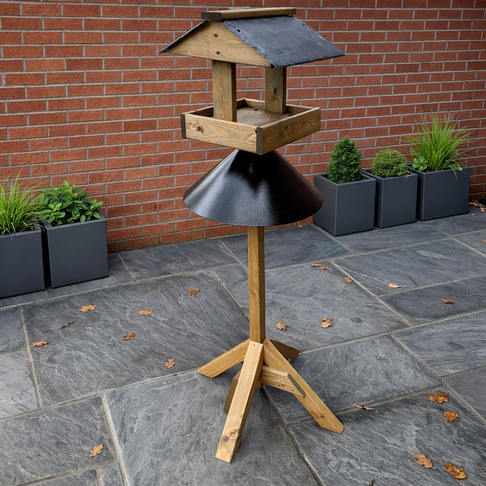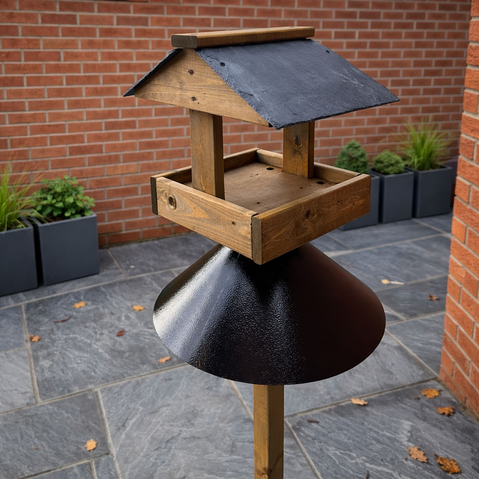 This Wooden Bird Table is a UK made outdoor bird table designed to be sturdy, stylish, and long-lasting. This high-quality freestanding bird table doubles as a durable wooden bird feeder and features a heavy-duty squirrel metal guard baffle, making it a reliable squirrel proof bird table for any garden. With its elegant slate roof bird table design, it also serves as a true luxury bird table. Crafted from weather-resistant tan brown timber, this weatherproof bird table is protected against rot and fungal attacks, ensuring year-round durability. The timber is sustainably sourced, making it an eco-friendly choice. Delivered in two packages, it requires simple self-assembly with all screws included.