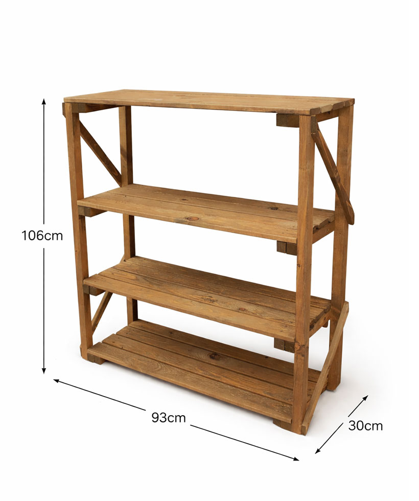 This wooden greenhouse shelving staging unit is a strong and durable 4 tier greenhouse shelving solution, ideal for plant display and storage in greenhouses, garden sheds, garages, and other outdoor spaces. Proudly made in the UK, this wooden plant shelving unit is manufactured from high-quality smooth planed 18 mm timber shelves with sturdy 35 mm x 35 mm square timber sides, making it a reliable garden shelving unit and outdoor wooden shelving option. Supplied in six sections (two sides and four shelves), it features pre-drilled holes with screws included for quick and easy assembly. Finished in a protective brown tan wood satin suitable for outdoor use, this versatile garden shed shelving can also be painted to any colour to suit your space. Please note, items shown on the shelves are not included in the sale.