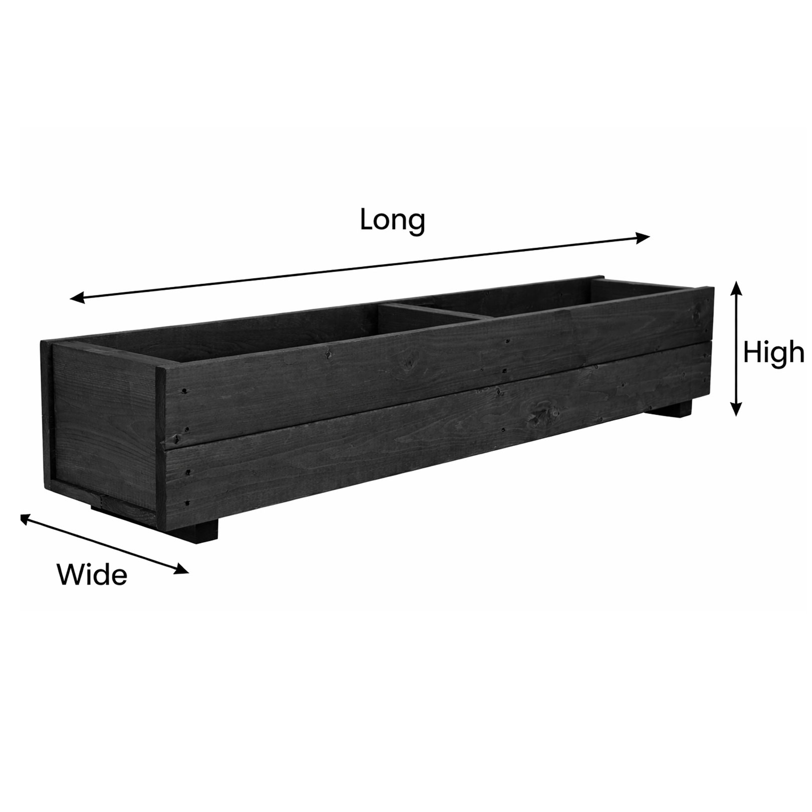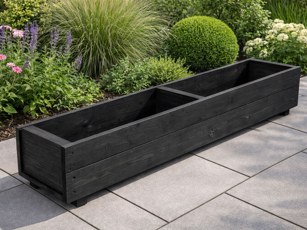 This impressive handmade modern black ash wood stain large 120 cm long wooden trough planter will look tremendous when in full bloom planted with your favourite perennial or annuals plants.