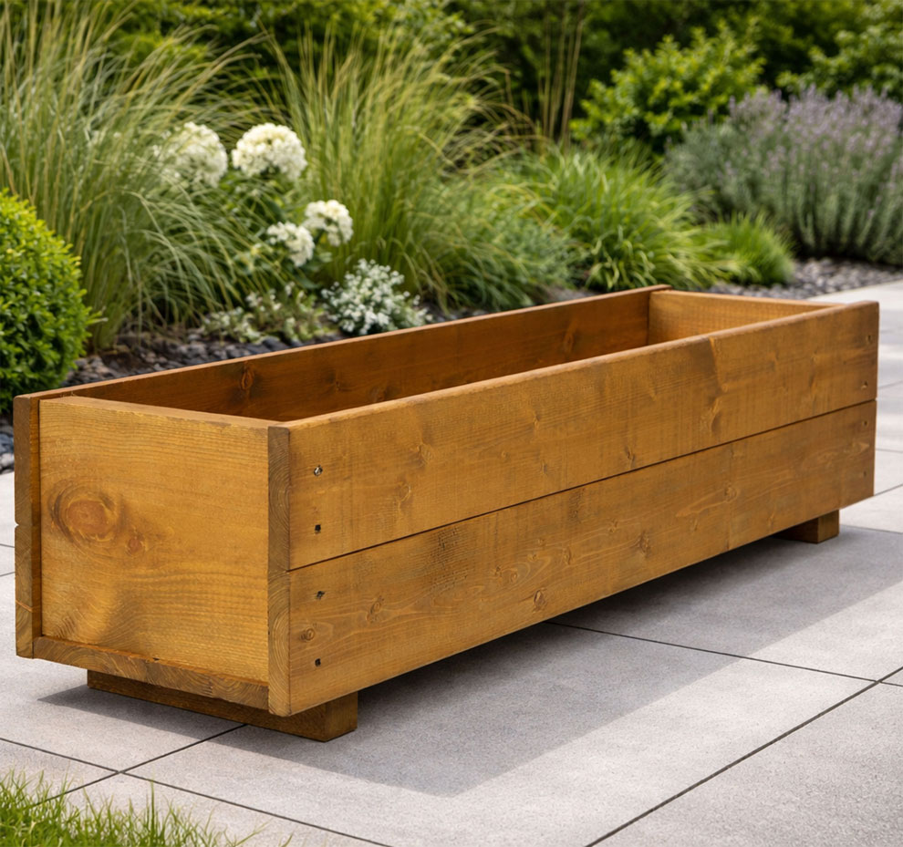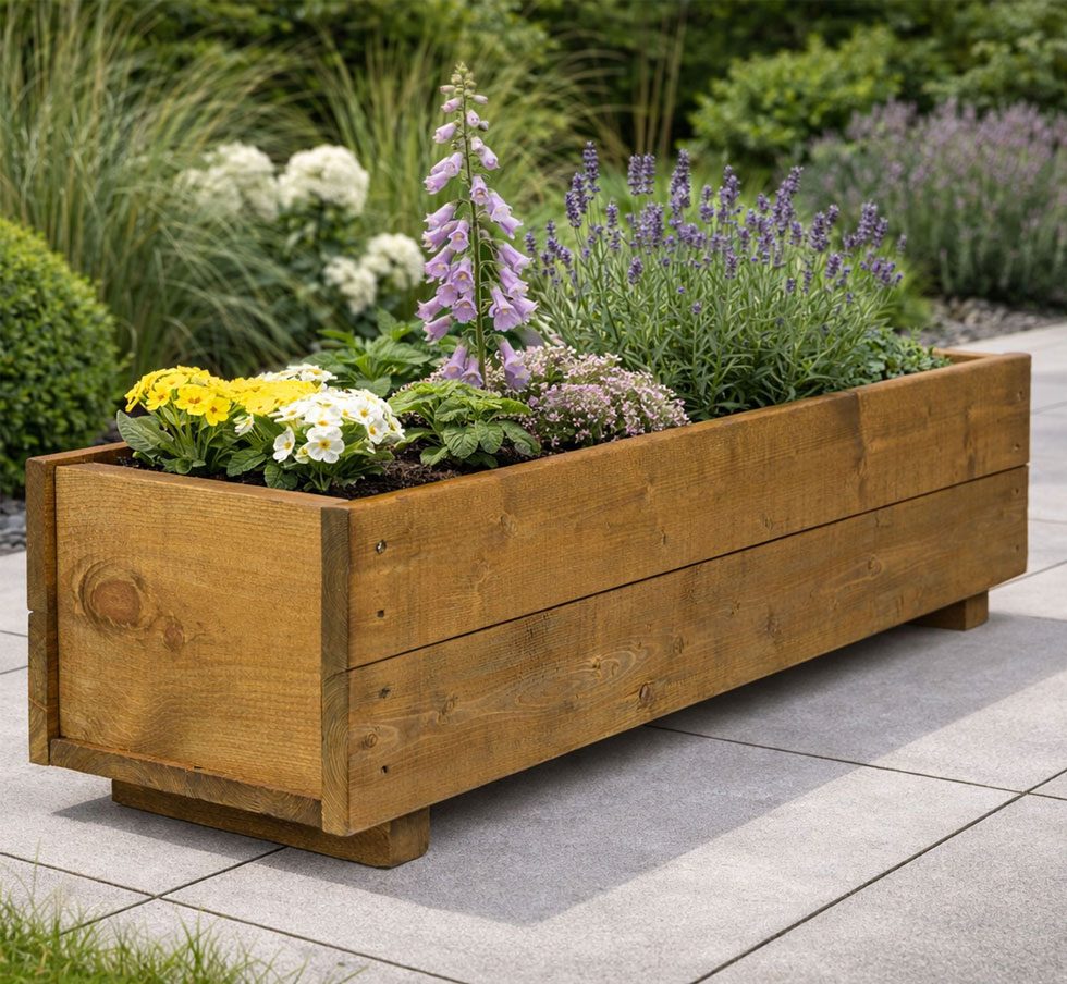 This stylish traditional timber rectangular shaped wooden trough planter is designed and handmade in Great Britain from high quality planed 15mm side timbers and 35mm timber end boards. These wooden flower boxes have raised fitted feet for good air circulation and drainage. These rectangular planter boxes are supplied with a brown weather shield wood stain offering weather protection.